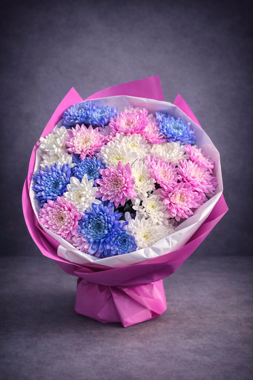 Canlı Renklerin Uyumu: Buket, mor, fuşya pembesi ve masum beyaz kasımpatılardan oluşur. Bu kontrast, ona modern ve göz alıcı bir hava katıyor.
